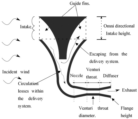After air is collected by the omnidirectional intake of INVELOX, it is directed towards the nozzle–diffuser section where, in the throat section, work is done by the air on the turbine blades, and thus its energy is converted to mechanical energy. Before the air steam reaches the turbine blades, it undergoes a shear loss, which can be ignored for simplicity purposes. The enthalpy, therefore, in the air stream, which goes through a cross sectional area A1, can be expressed by Equation (3) as.