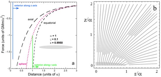 Gravitational forces around the upper right quadrant of a highly flattened oblate spheroid: (a) Values of force along the two special directions for a body with ε/α = 0.1, shown as a grey oval (where ς is the polar radius), compared to the force around a sphere of equivalent mass (pink dotted curve). At 10 body radii (Distance = 10 α; offscale), the forces along special directions of this flattened spheroid only differ from than that of the sphere by ±0.3%; (b) Directions of force, which are continuous from outside to inside the body (faint gray oval). Both parts modified after Hofmeister et al. [] (Figures 4a and 7f therein), with permissions.