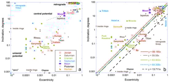 Orbital properties of moons of the solar system, showing correspondence of orbital inclination with respect to the planets’ equator with orbital eccentricity. Data from NASA []. Box links symbols to planetary systems. Least-squares fits include the origin: (a) Plot differentiating retrograde moons. Large, round moons (α > 1400 km) are labelled. Only Triton is retrograde. Regarding tiny Hippocamp of Neptune, 5 moons of Saturn inside the main rings, and 3 moons inside Saturn’s ring E, zero was listed for either e or i or both. To depict these satellites on logarithmic plots, we set e = 8 × 10−6 and/or i = 0.0008°, which values are below all reports for other moons: consequently these 9 moons plot on the axes or at “zero.” The main groupings, as labeled, suggest correlations with potential of the central body; (b) Same data, except that retrograde moons are plotted with inclination reduced by 180o. Fits excluding retrograde moons are similar. Moons that deviate greatly from the depicted trends are labelled, as are all large moons.