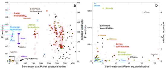 Orbital eccentricity and inclination of moons as a function of their semi-major orbital axis normalized to the equatorial radius of the central planet, using scales appropriate to both distal and proximal moons. Data from NASA factsheets []. For the retrograde moons, the inclination shown = 180o minus that reported. Solid symbols = inclination (right axis) and open symbols = eccentricity (left axis), where the color scheme is the same as in Figure 4: (a) Plot of all moons with a/α < 425. This cutoff excludes one of Saturn’s 79 moons which is near 450 body radii; plus 5 of Uranus’s 24 moons and 5 of Neptune’s 14 moons, all of which are much further out, reaching a/α = 10,000. These 11 moons orbit with a wide range of i and e, like the cluster near a/α of 300. Large Triton is retrograde in a tilted, circular orbit, whereas Hyperion has a chaotic orbit, attributed to interactions with Titan; (b) Expanded view of the box near the origin in the left panel. Pluto’s tiny moons [], which actually orbit the Pluto-Charon barycenter are not shown: see text for discussion of this unique satellite system.