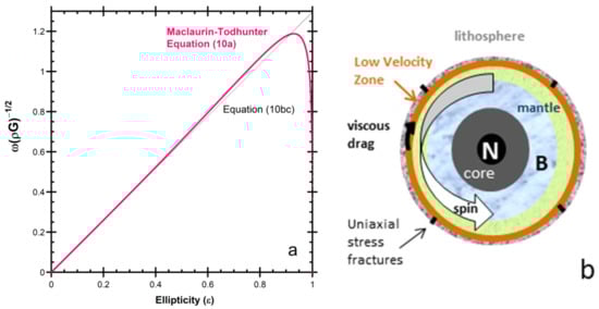 Behavior of spinning self-gravitating bodyies: (a) Spin of a homogeneous density, fully solidified oblate. Modified after Criss [] (Figure 1 therein), with permissions; (b) Primary mechanism of differential rotation for the Earth. Equatorial slice, showing internal structure, down the North pole (N), showing uniaxial stress cracks (black bars), layers (various patterns), and drag (black arrow). The Earth’s lower mantle (blue marble) spins through the barycenter (B) on a daily basis. This variation is not entirely longitudinal because the spin axis is inclined to the lunar orbit and to the barycenter orbit. Dark grey = liquid outer core. Samples are limited to origins in the upper mantle (light blue stipple). Modified after Hofmeister et al. [] (Figure 2e therein), with permissions.