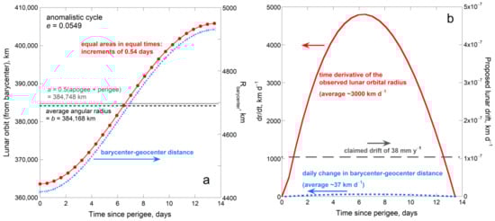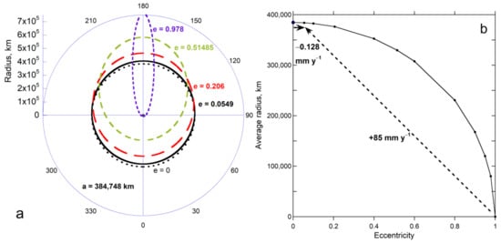 Astronomical observations [,,] show that the current, average lunar orbit, even 4.5 × 109 y after formation, remains nearly circular (Figure 7a), despite Solar forces acting on the Moon being double Earth’s. This observation testifies to stability of the lunar orbit. Conservation of energy, and Solar forces providing torque in the 3-body geometry cause eccentricity to increase, which contracts the semi-minor axis while maintaining the semi-major axis (Figure 7a). Consequently, the average lunar radius has decreased over geologic time (−0.13 mm y−1; Figure 7b). Inclination of the lunar orbit from Earth’s equatorial plane is consistent with Solar torque existing, unopposed, but the inclination is not part of the orbital energetics. The change in i is rather small and is consistent with stability and tiny changes in eccentricity.