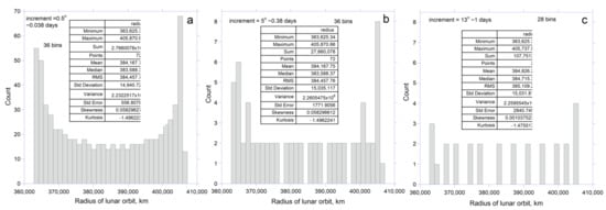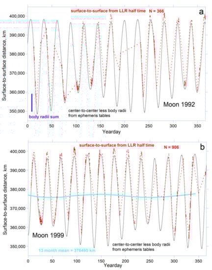 Various scenarios for formation suggest slow growth of the average radius of the lunar orbit. For example, if the Moon was ejected from the Earth or fission occurred [], its current average orbital radius suggests growth at ~90 mm y−1 assuming zero radius at solar system beginnings. This upper limit for recession is 12 or 13 orders-of-magnitude smaller than orbital velocities (Section 2.2), and is far too small to quantify based on observations against the stars. Alternatively, as proposed by Laplace, the Moon could have formed from a ring of dust around the Earth (see, e.g., [,] and references therein). Co-accretion points to an originally circular orbit at some finite radius, permitting negative values for lunar drift. Section 5 provides details.