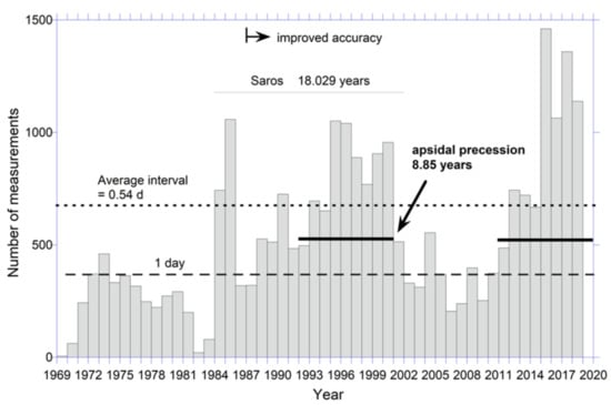 Due to inclination, eccentricity, the variable orientation of the lunar orbital plane with respect to the fixed reference frame of the barycenter plane, and the anomalistic cycle not being some simple fraction of a year (i.e., the barycenter orbital period of 365.25 days), the orbit of the Moon around the Sun involves several long cycles. Many are on human time-scales [,,,]. Apsidal precession takes 8.85 years (Figure 2). The ~19 year Metonic cycle links the synodic month to the tropical year, but the Callippic cycle of 76 years is more exact. The Saros cycle of 18.029 years concerns eclipses, and thus a special repeated orientation of the lunar and barycenter planes.