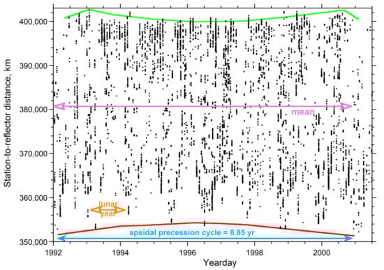 Crucially, annual resetting of the geocentric reference frame at the vernal equinox greatly complicates, if not prohibits, quantification of multi-year changes. Thus, to measure possible tiny perturbations of the Moon’s orbit, laser light is reflected from retro-reflectors (denoted “mirrors” for brevity) placed on the Moon by astronauts (e.g., []). See Section 6 for details.