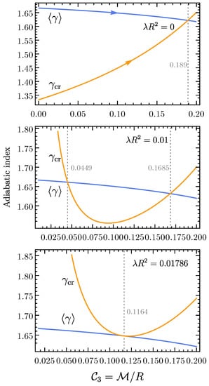 : Pressure-averaged and critical adiabatic indices (top panels), and central velocity dispersion (bottom panels) vs. curvature parameter . The configurations are unstable if , and the instabilities will set in at critical points . The arrows on the lines of adiabatic indices exhibit the directions when the fluid sphere is being compressed while keeping and fixed. For , there is no crossing of the two indices, thus no instability will be triggered. For example, for (left), () is maximal (minimal) at and decreases down (increases up) to zero (two) as R decreases and the two indices never cross. On the contrary, instabilities can occur for . For (middle), the instability can set in at with ; however, for (right), it is at with ; no instability can be triggered if regarding causality.