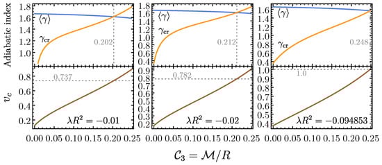 : Pressure-averaged & critical adiabatic indices (top panels), and central velocity dispersion (bottom panels) vs. compactness given . The configurations are unstable if , and the instabilities will set in at critical points . There is only one critical point for . For (left), the instability is to be triggered at with ; however, for (middle), it occurs at with . Compared to in Figure 1 (top), it becomes harder to trigger the instabilities as higher (thus ) is required if is more negative until (right), at which with the causal limit . Beyond this point, no physical configuration can trigger the instability on the grounds of causality. In Table 2, we list the critical points at causal limits for and 7.