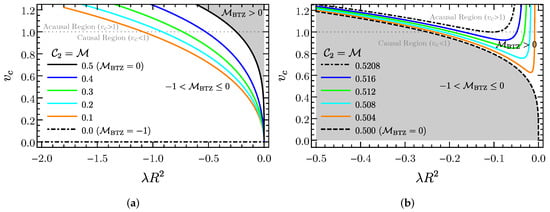 We note that the ADM mass in (2 + 1) is the BTZ mass [63,64,65], rather than the fluid mass. The phase diagrams of homogeneous fluid configurations with and are shown in Figure 3a,b, respectively. The absence of fluid corresponds to the BTZ bound state (anti-de Sitter space) , which is separated from the mass spectrum. The fluid mass is the BTZ ground (vacuum) state . For , they are a sequence of states of naked conical singularity [63], , if the fluid were to collapse. Furthermore, the threshold to have BTZ excited state is . It is interesting to note that the central velocity dispersion is always monotonically increasing in for , while there are minima of for , and no causal solution if . This manifests that the two-phase diagrams are separated by the phase boundary (or ).
