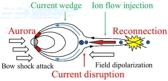 There are many substorm models, and they all involve three key node phenomena, including the magnetotail lobe reconnection, cross-tail current disruption, and aurora brightening (see Figure 1). The widely accepted models are the near-Earth current disruption model [,,,] and the near-Earth neutral line model [,]; both include the three key phenomena mentioned above, but occur in different timing sequence.