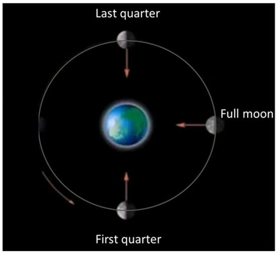 Schematic diagram of lunar orbit. Three simulation positions are labeled as first quarter, last quarter, and full moon.