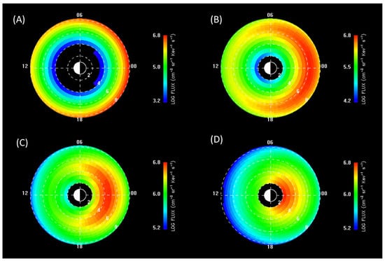 We simulate the dynamic process of magnetospheric substorms with the increase in the Kp index combined with ion pitch angle diffusion. The low-altitude polar ENA enhancement caused by substorms often appears before midnight and is accompanied by eastward drift. When the ENA-enhanced signal decays, it will be accompanied by westward movement [,]. Thus, we mimic the substorm growth phase with the Kp index ascending sequence of the simulation images at the full moon and the first quarter (Figure 5 and Figure 6). The substorm recovery phase is simulated with the Kp index descending sequence of the simulation image in the last quarter (Figure 7).