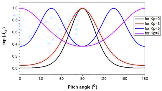 Here, the parameter Kα (adjusting the pitch angle distribution width) corresponds to the Kp index from 0 to 7, which simulates the dynamic evolution of pitch angle from pancake to butterfly during a substorm [,,,], as shown in Figure 4.