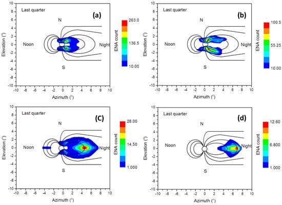 Simulation distribution of Luna based ENA imaging at the first quarter with the same Kp index order from (a–d) as Figure 5.