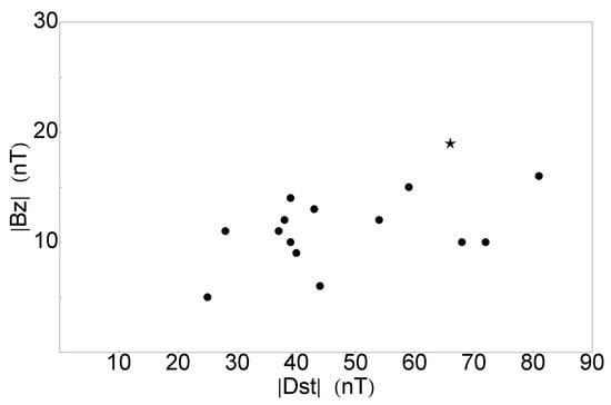 Scatter plot of the modulus of Dst index and component of the events in Table 2. The 2022-02-03 case is shown with a star symbol.