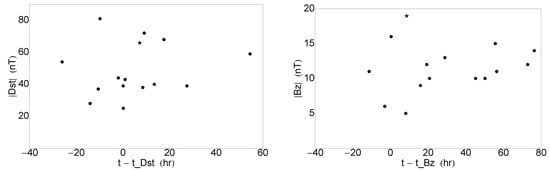 For completeness, we show the time differences between the Starlink launches and Dst time (Figure 2, left) and Starlink launches and time (on the right). Positive numbers denote GSs occurring before the launches (preceding or ongoing at the time of spacecraft deployment), which is the majority of the cases, whereas negative times denote successive events (which take place after the spacecraft has been launched). The Starlink failure is a GS-preceding case but relatively close to the launch time in both cases. Its accompanied GS (denoted as nT) is among the largest GSs in the list but not the strongest, which occurred on 2022-07-07 with Dst nT (we have identified an ICME, but no IP shock, SF or particle events in this case).
