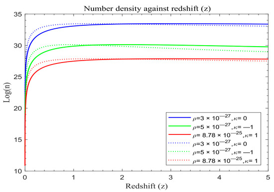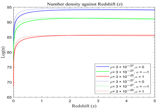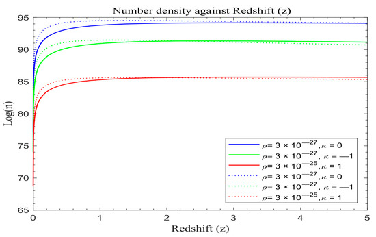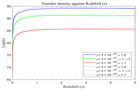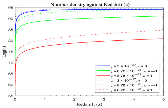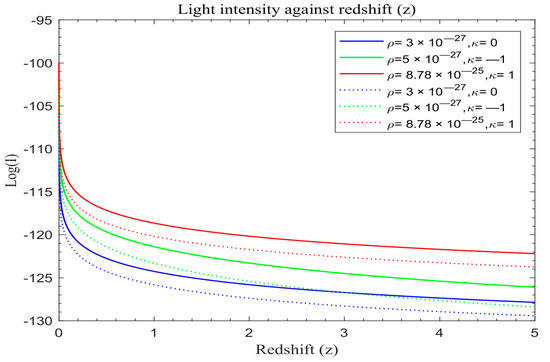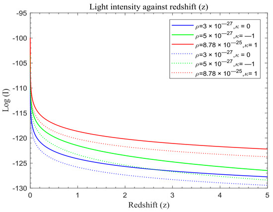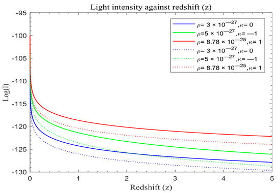 Equation (7) represents the time taken for a light photon to travel at a distance = , describing a matter-dominated Friedmann universe. Friedmann Equations (3) and (4) in the form of Equation (7) will later be employed in this paper to derive the light intensity–modified redshift and number density–modified redshift relations.