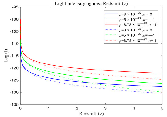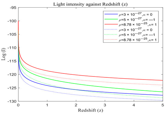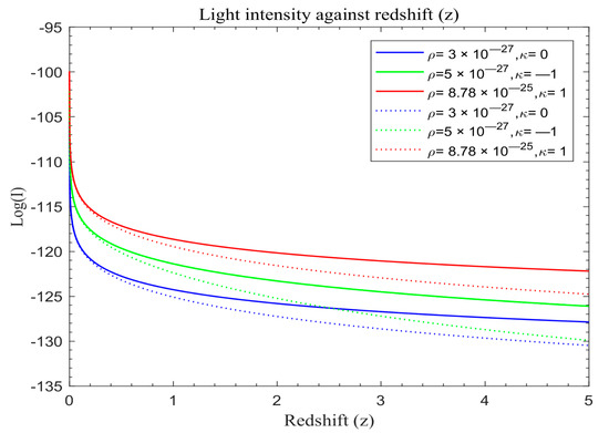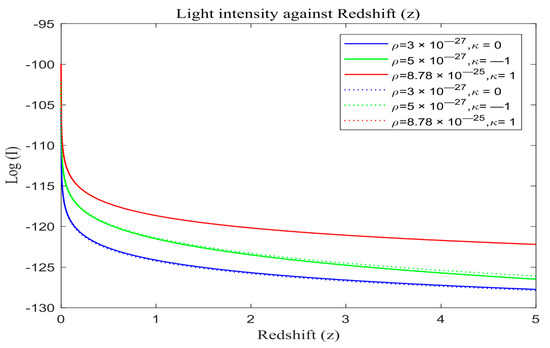 Figure 1, Figure 2, Figure 3, Figure 4, Figure 5 and Figure 6 portray simulation outcomes for the evolution of light intensity for both the modified Friedmann model and the standard redshift model grounded in Equations (25) and (30) respectively. These visual representations offer a nuanced understanding of the intricate dynamics governing the evolution of cosmic structures under distinct cosmological paradigms. The standard redshift model displays the simulation results in solid lines while modified models are in dotted lines.
