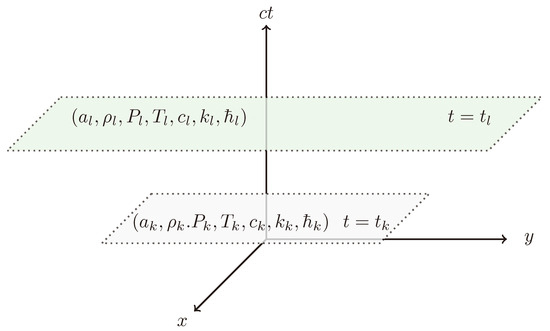 In this equation, the speed of light is expressed as a function of time, deviating from the conventional RW metric. Initially, this formulation may appear unconventional or counterintuitive. However, as depicted in Figure 1, the original RW metric implies that on hypersurfaces defined by or constants, various quantities such as the scale factor , mass density , pressure , temperature , speed of light , Boltzmann constant , and Planck constant remain constant regardless of the 3D spatial position. However, according to Weyl’s postulate, these quantities or constants can be expressed as functions of cosmic time t, accounting for cosmological redshift, as depicted in Figure 1. Traditionally, it has been assumed that physical constants, including the speed of light, remain constant over cosmic time. This additional assumption, namely that the speed of light remains constant () regardless of cosmic time, is not directly linked to the two conditions necessary to derive the RW metric: the CP and Weyl’s postulate. The constancy of the speed of light relies on cosmological time dilation, and it is essential to note that the GR does not specify any particular physical laws governing this constancy, as we will elucidate shortly. As the Universe progresses from to , physical quantities such as , , , and change over cosmic time t. The precise functional expressions for these quantities are obtained through the solution of Einstein’s Field Equations (EFEs) and Bianchi’s identity (BI), considering the equation of the state of fluids [52,84].