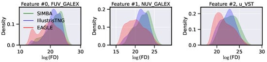 Kernel density estimate plots of the log of flux densities (FD) for the first three features. The feature names at the top of each plot are the names of the filters, each centered at a different wavelength, in which photometry was simulated. We notice that for the three features shown here, all three simulations share the same support, which justifies our decision of using KLIEP.