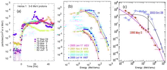 - Tylka, A.J.; Cohen, C.M.S.; Dietrich, W.F.; Lee, M.A.; Maclennan, C.G.; Mewaldt, R.A.; Ng, C.K.; Reames, D.V. Shock geometry, seed populations, and the origin of variable elemental composition at high energies in large gradual solar particle events. Astrophys. J. 2005, 625, 474. [Google Scholar] [CrossRef]