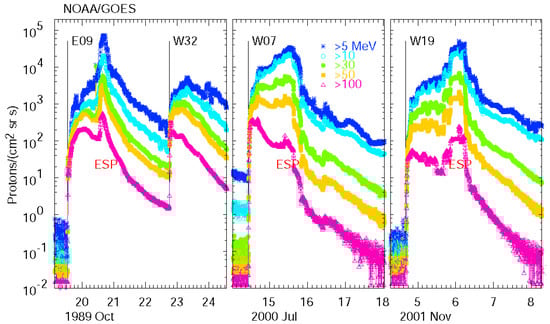 - Kahler, S.W.; Sheeley, N.R., Jr.; Howard, R.A.; Koomen, M.J.; Michels, D.J.; McGuire, R.E.; von Rosenvinge, T.T.; Reames, D.V. Associations between coronal mass ejections and solar energetic proton events. J. Geophys. Res. 1984, 89, 9683. [Google Scholar] [CrossRef]