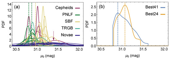(a) Distance moduli of the measurements from [1] represented as Gaussian distributions with locations and their individual standard errors as standard deviations. Vertical dashed lines mark values with no errors reported. Arrow points to the Tammann et al. [12] measurement (see Section 3). (b) Distributions of the investigated samples. Vertical dashed lines mark the respective modes; their difference equals 0.17 mag.