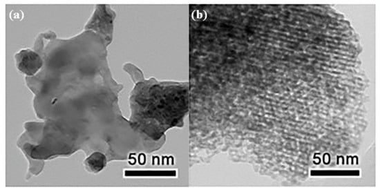 TEM image of a reduced (a) 5Ni/La2O3-n catalyst (from nitrate) and (b) a 5Ni/La2O3-m catalyst (with template). Reproduced with permission from []. Copyright 2019, Elsevier.