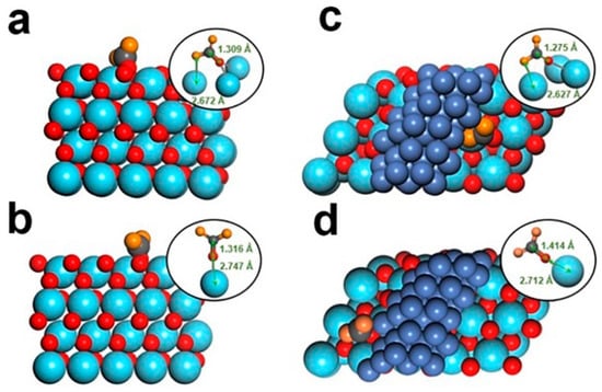 DFT calculations of two modes of CO2 activation: (a,c) bidentate carbonate and (b,d) monodentate carbonate. Colors: Ni—steelblue; C—gray; La—cyan; O—red and orange. Reproduced with permission from []. Copyright 2019, Elsevier.