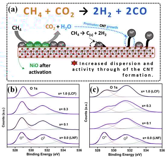 (a) Carbon nanotube formation scheme on Ni/Al2O3 modified with La2O3. Reproduced with permission from []. Copyright 2018, Elsevier. (b) XPS profiles of O 1 s of the (b) fresh and (c) spent La(CoxNi1–x)0.5Fe0.5O3 with x = 0.0, 0.1, 0.3, and 1.0. Reproduced with permission from []. Copyright 2019, Elsevier.