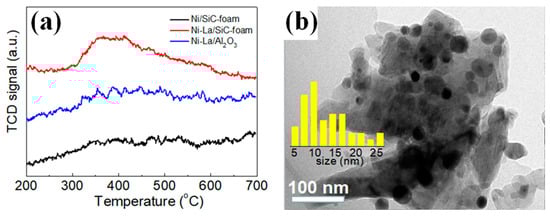 (a) CO2–TPD profiles of spent catalysts. (b) TEM images of spent Ni–La2O3/SiC-foam. Reproduced with permission from []. Copyright 2021, Elsevier.