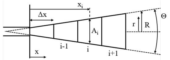 In Equation (3), is the mass and is the density of the liquid fuel. The overbars on the liquid fuel fraction and the velocity denote that these values are cross-sectional averages. The value results from integrating the fuel and velocity distribution over the cross-section area []. The subscripts i and j denote the control volume (c.f. Figure 1) and the timestep, respectively, with the time-step size . In Equation (4) the momentum of the control volume is calculated using the mean density of the control volume .