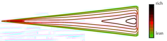 With the aforementioned equations the axial fuel distribution inside the spray is calculated in every timestep. Due to the application of the radial Abramovich distribution from Equation (2), a pseudo-2D fuel distribution as shown in Figure 2 is calculated at every timestep. The spray model neglects the cylinder walls. However, the control volumes are defined for a length longer than the theoretical distance between the injector and the cylinder wall, to not lose any fuel in the mass balance, which could leave the last control volume. The control volumes outside the combustion chamber are then treated different during calculation of the ignition delay.