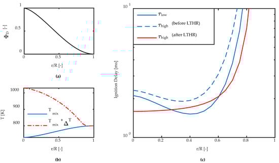 Figure 3a shows an exemplary fuel distribution inside a control volume plotted over the dimensionless radius r/R. The mixing temperature Tmix in Figure 3b results from the mixing and evaporation of the pilot fuel and is, therefore, the coldest at the richest spot. After the LTHR, the opposite is the case, as the higher fuel concentration leads to a higher temperature increase ΔT. Resulting from the temperature and fuel distribution two different profiles of the local reactivity occur, which are presented in Figure 3c by the local ignition delay time. Before the first stage of ignition has occurred, both the low and high temperature ignition delay times have their minimum value, which defines the most reactive mixture, in the leaner region. This minimum results from the contrary effects of the decreasing fuel concentration leading to lower reactivity and the increasing temperature leading to higher reactivity. Thus, after the LTHR has occurred, the most reactive mixture is at the centerline of the spray, because this is the hottest and richest spot.