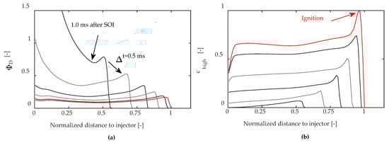 Figure 4a shows an exemplary evolution of the axial fuel distribution of a pilot injection up to ignition and Figure 4b shows the respective reaction progress for the high temperature ignition. Ignition occurs if the progress variable reaches unity.