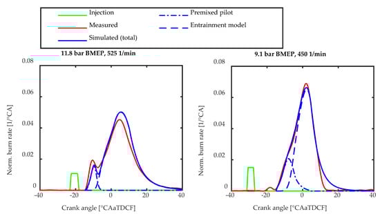 Walther et al. [] implied a Livengood–Wu integral [] to each package in the spray model using an ignition delay correlation derived from reaction kinetics calculations. After ignition the spray model is terminated, and all the fuel is burned with a turbulent entrainment model. The flame front is assumed as cone shaped in the beginning of the combustion and the transitions to a hemispherical flame front, whereas the spray cone angle and the initial size of the flame front are derived from optical investigations. The model was validated against measurement data from a high-speed dual-fuel engine. A similar approach was presented in Ref. [] and validated against measurement data from a 1.95 L four-cylinder diesel engine, operated in dual-fuel mode with biogas as main fuel. In Ref. [], the same approach is applied in a real-time capable hardware in the loop application and validated with a heat release rate from a medium-speed dual-fuel engine.