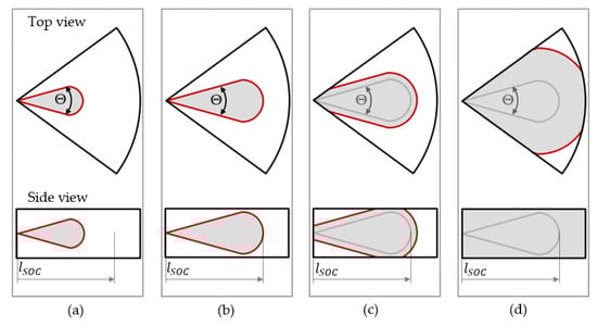 - In the first phase of the combustion (Figure 6a,b), the flame front is cone shaped with a spherical tip, until the length of the cone equals the spray penetration in the spray model at the start of combustion (lSOC);