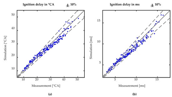The ignition delay time is defined as the time between the start of combustion and the time when 2% fuel is burned, to enable an accurate automated evaluation of the measurement data. Figure 8 shows a comparison of the measured and simulated ignition delay times in crank angle and time, with a coefficient of determination (R2) of 0.953 and 0.959, respectively. The injection duration for 98% of the shown cases is approx. 1.6 ms. As the ignition delay time is a multiple of the injection duration in the majority of the cases, the spray is highly diluted at the time of ignition. In a previous publication [], the model was also validated against measurement data from a different dual-fuel engine with a regular pilot injector, showing similar good results.