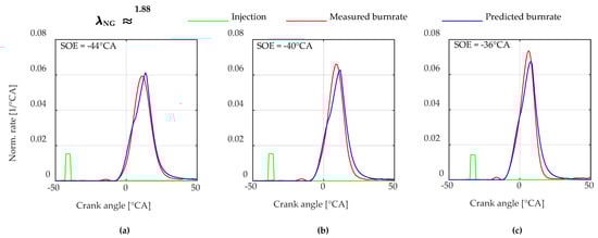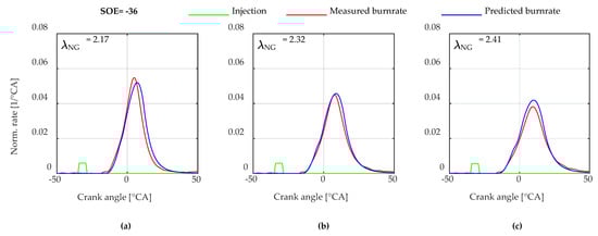 Comparison of the measured and simulated normalized burn rates at 675 rpm, 18.4 bar BMEP, and a constant injection timing of the pilot fuel with SOE = −36 °CA. Charge air pressure is varied, resulting in different air-to-fuel ratios of the natural gas/air mixture (: (a) = 2.17; (b) = 2.32; (c) = 2.41.