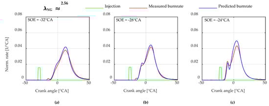 Comparison of the measured and simulated normalized burn rates at 450 rpm, 9.1 bar BMEP, and an air-to-fuel ratio of the natural gas/air mixture ( of 2.56. Injection timing of the pilot fuel is varied by start of energizing (SOE): (a) −32 °CA; (b) −28 °CA; (c) −24 °CA.