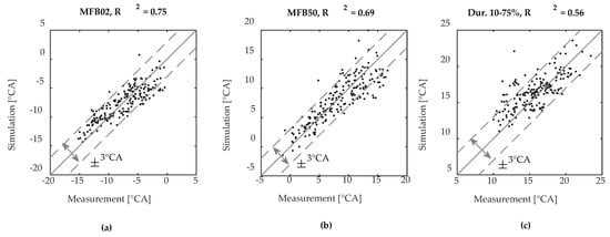 Comparison of the measured and simulated combustion parameters: (a) start of combustion MFB02; (b) center of combustion MFB50; (c) Burn duration 10–75%.