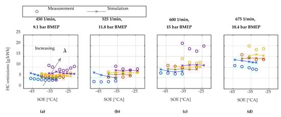 Comparison of measured and simulated HC-emissions for the four operation points on the 120% propeller curve. The different colors indicate different charge air pressures. The variations are plotted over the injection timing, characterized by the start of energizing (SOE) of the pilot injector. Negative values indicate timings before top dead center. The operation points are: (a) 450 1/min and 9.1 bar BMEP; (b) 525 1/min and 11.8 bar BMEP; (c) 600 1/min and 15.0 bar BMEP; (d) 675 1/min and 18.4 bar BMEP.