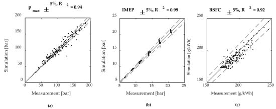 Figure 14 gives an overview of the operation parameters indicated mean effective pressure (IMEP), maximum cylinder pressure and brake specific fuel consumption (BSFC) for 191 different measurement points, which cover the full engine map and the λ- and SOI-variations at the 120% propeller curve. The IMEP and the BSFC show an overall relatively small error. The error of the maximum cylinder pressure is a bit higher, but still the coefficient of determination (R2) is acceptably high. The results presented in Figure 14 show that the model is able to predict the engine behavior in a wide range of boundary conditions.