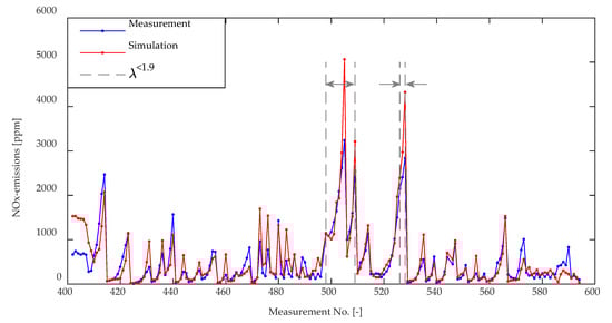 For the calibration of the NOx-model, the same operation points were used as for the combustion model. The NOx multiplier was set to a value of 8.5138. Figure 15 shows the measured and simulated NOx-emissions for 191 different measurement points, which cover the full engine map and the λ- and SOI-variations at the 120% propeller curve. The highlighted measurement points have low air-to-fuel ratios of λ < 1.9, which cause high NOx-emissions. The overall trends are in good agreement with the model. In particular, the SOI variations, which result in strongly increasing NOx-emissions, are captured well.