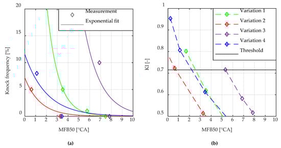 The knock model was calibrated at one operating point at 600 rpm and 15 bar BMEP with a knock frequency of 5%. The resulting KI of 0.7153 is the threshold for knock simulation. Thus, a KI ≥ 0.7153 in the simulation refers to a knock frequency ≥ 5%. Figure 16a shows the knock frequency which was calculated from the measurement data for MFB50 variations at 450 rpm and 9.1 bar BMEP at different charge air pressures and charge air temperatures, which are listed in Table 2. Figure 16b shows the respective KI values from simulation using the combustion model. The absolute values of the measured and simulated knock limited MFB50 are listed in Table 2. The results are promising, as not only the trend is predicted correctly, but also the absolute error is comparably low for the variations 1, 2, and 4.