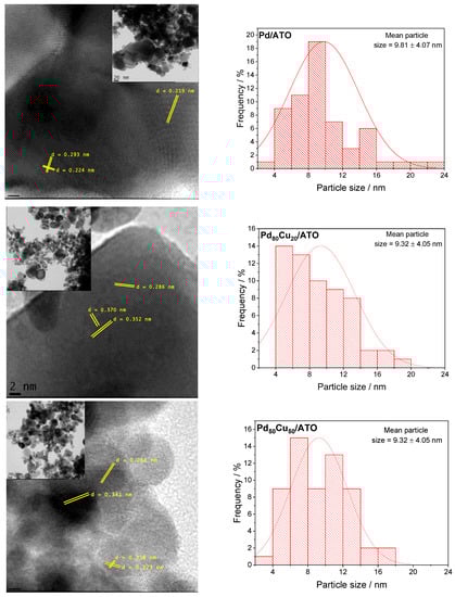 It is observable that the catalytic nanoparticles are agglomerated in some regions of the oxide-based support, and this type of morphology was also observed for other nanoparticles supported on metallic oxides, such as ATO and TiO2 [,,]. Additionally, the nanoparticles composed of Pd and Cu had a high degree of crystallinity. It is possible to observe planes with distances of 0.438, 0.312–0.340, and 0.220–0.250 nm, characteristic of nanoparticles of metallic alloys supported on ATO, similar to that reported by Qu et al. [].