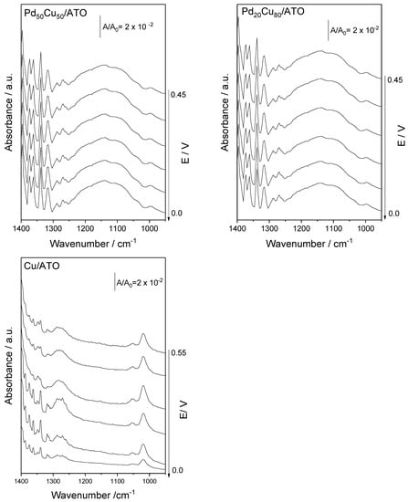 For the materials Pd50Cu50/ATO and Pd20Cu80/ATO, it was possible to see the band referring to carbonate ions at 1375 cm−1 [,], indicating that the association of Pd with high amounts of copper can promote more oxidized species. This feature was also marked by the wide band centered at 1140 cm−1, indicating large proportions of sodium formate, confirmed by the narrow band at 1345 cm−1 [] which was also well distinguishable in other materials.