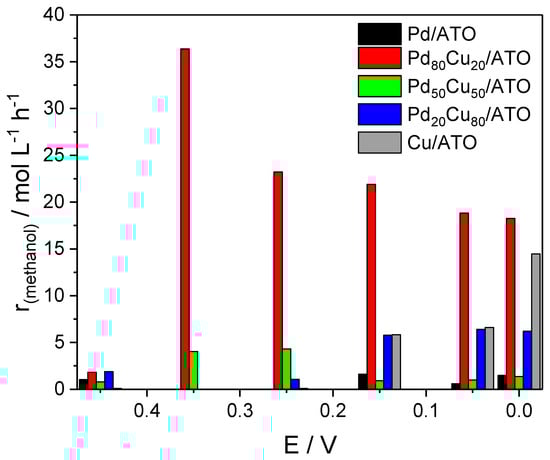The methanol produced was quantified by liquid chromatography and reported as a rate reaction according to Equation (5) and the result is provided in Figure 6, where it is observable that the Pd80Cu20/ATO composition is the most active for the conversion of methane into methanol at all potentials.