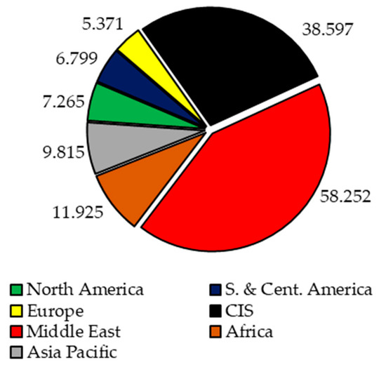 In 2015, about 48% of the hydrogen generated worldwide was obtained from the natural gas conversion process, a favorable situation considering that this raw material exists in abundance all over the world with about 138,024 thousand million barrels in provenance with data obtained from 2020, as shown in Figure 3 [7].