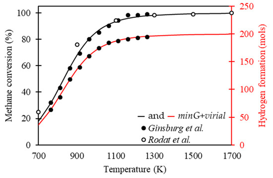 Figure 5 presents the methane conversion and hydrogen formation as a function of temperature throughout the methane cracking process, calculated using the Gibbs energy minimization methodology. These are verified in the data calculated using correlations to calculate the equilibrium constants reported by Ginsburg et al. [40]. In addition to this, kinetic parameters were presented by Rodat et al. [41] for calculating the methane conversion. Both results show the behavior of the methane cracking process at 1 atm with 100 mol of methane in the feed.