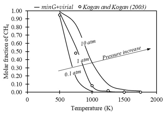 Figure 6 presents the influence of pressure on the methane cracking process. The results of the mole fraction of methane as a function of temperature are presented for fixed pressure conditions with 1 mol of methane in the feed. The simulated data using the Gibbs energy minimization methodology are presented with the results reported by Kogan and Kogan [39]. These present the mole fraction of methane in the gas phase as a function of temperature for the system operating at 1 atm with 1 mol of methane in the feed. The data were obtained in the thermodynamic equilibrium condition using the NASA CET-85 program simulating the operational conditions of isothermal reactors.